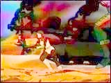 This sequence is one of my favorites because the depiction of a person running has reached a fluid perfection. There are also two very powerful touches to the clip, which was recycled from issue #14: one, dirt is kicked up as Flash runs by the viewer; two, there are layers of moving objects passing by one another at a realistic pace. |