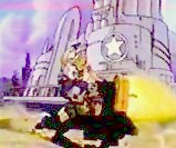 Although the animators were not allowed to show a character injured from an explosion in the television series, the last shot in this commercial animation sequence features a much more intense because the character is mere inches away from the explosion.