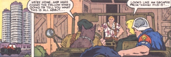 With a gun in one hand and Order by his side, Law radios Lt. Falcon that General Hawk has disembarked from a commercial jet and then the stranger suggests to General Hawk that he climb into a jeep with Lt. Falcon. Meanwhile, Buzzer and Zarana stop at Zartan's gas station headquarters and discover that their fuel is being stolen by Zanzibar and Monkeywrench, who are immediately attacked by Zarana and Buzzer since they were intending to steal the gas. However, Zanzibar offers a piece of information which saves him from Zarana's pounding fists. General Hawk enters an abandoned Miami hotel and meets Fastdraw and Chuckles, who explains that Lt. Falcon, Fastdraw and Law and Order were pulled from their current assignments and recruited for the Joe team. Their mission was to guard a missile that "conveniently disappeared" and is now aimed at Cobra Island. Suddenly, an old lady bursts into the missile's room and babbles about the location of the casino, but Zarana, who spots the missile, sheds her disguise as an elderly woman and joins Zanzibar and Monkeywrench as they try to destroy the missile and the Joes. Buzzer speeds away to the Cobra consulate building in Manhattan to warn Cobra, and shortly after the missile launches, a Cobra helicopter intercepts and destroys it with a missile of its own.