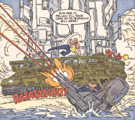 Zanzibar leaps over Zarana and Monkeywrench with his Air Skiff and informs them that he has found the Joes' new rocket base. With an insatiable appetite for destruction, the three Cobras streak to the base and attack General Hawk, Fast Draw, Chuckles, Lt. Falcon, Law and Order. Zanzibar tries to run over Fast Draw and General Hawk with his Air Skiff, but the Joes leap out of the way. Zarana fires the Dreadnok cycle's gun at the rest of the Joes, and while Chuckles leaps onto Zanzibar's craft, Fast Draw ends Monkeywrech and Zarana's violent rampage with a missile that causes the bike to flip over and self-destruct as the Joes' rocket launches into the air.