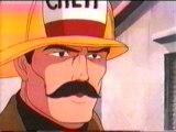 Meanwhile, the fire chief runs down an alley, climbs into a truck, and