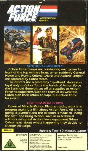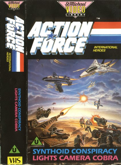 · Black screen with "Action Force Synthoid Conspiracy Lights Camera Cobra"